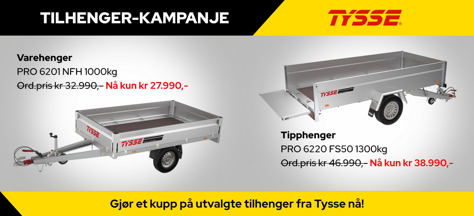 Vi har ett godt utvalg med Tysse tilhengere på lager. Våre medarbeidere hjelper deg gjerne med å finne riktig modell til ditt bruk. Fordelen med en Tysse varehenger er at den er designet og bygget i Norge for norske forhold. Det er også enkelt å få tak i deler om uhellet er ute. Alle modeller med totalvekt inntil 750 kg kan kjøres med førekort klasse B. Tysse sine fritids varehengere passer godt til deg som har liten eller mellomstor bil. Varehengeren er utstyrt med sklisikker bunnplate og sterke surrefester. Her kan du se utvalgte modeller fra Tysse.